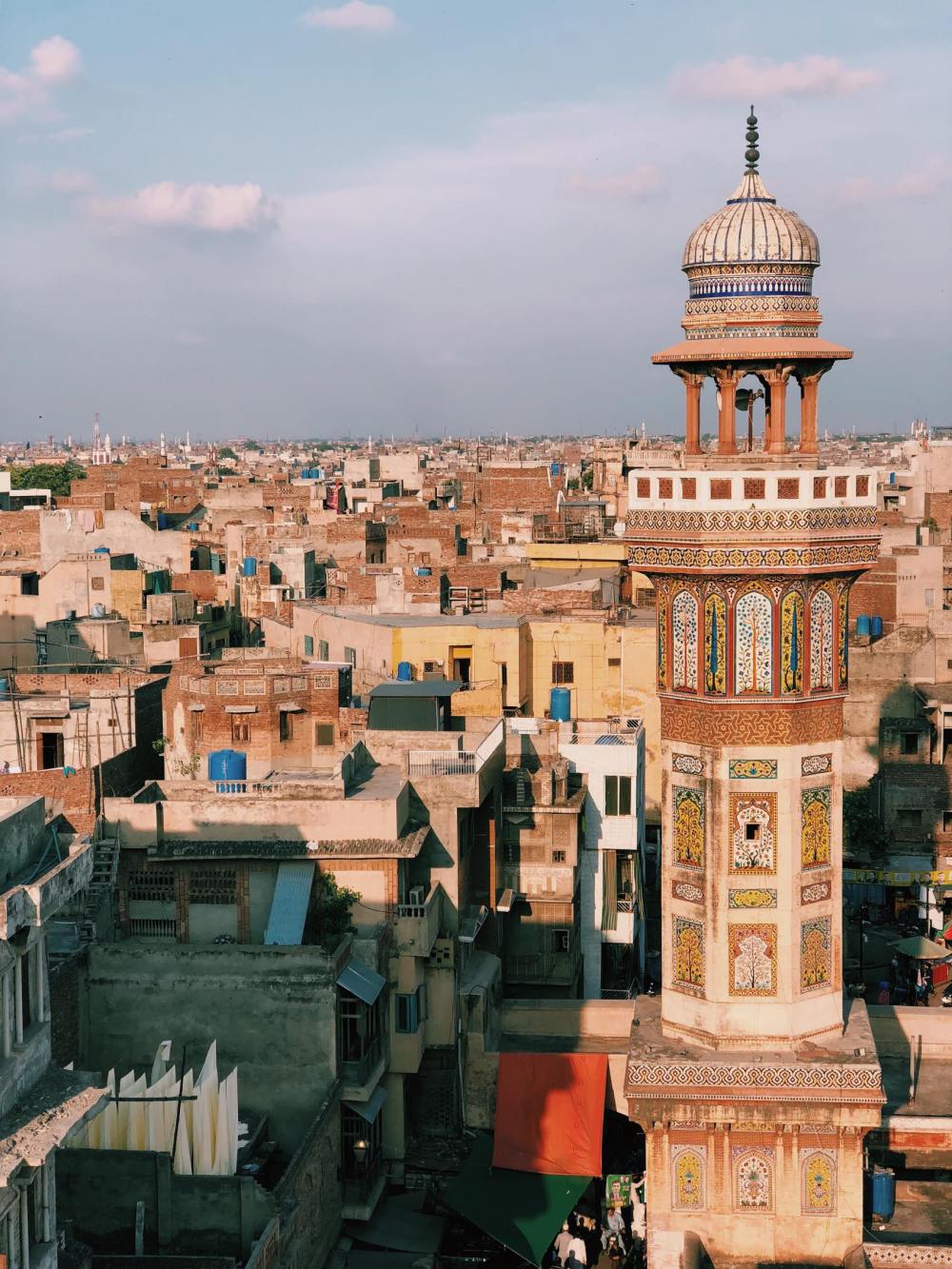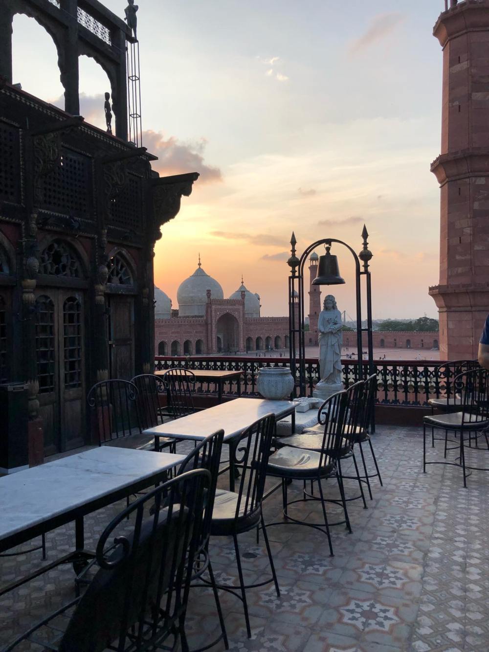 A colorful historic neighborhood with food stalls and fancy hipster restaurants that showcase nighttime views of the beautiful Badshahi Mosque.