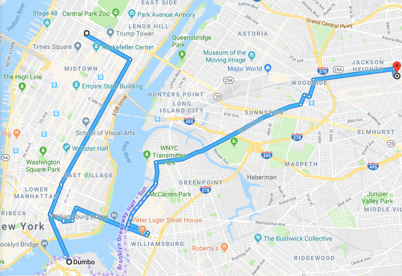 A friend of mine lives in Jackson Heights and Google Maps told us it’d be 50 mins whether we took the MTA or biked.